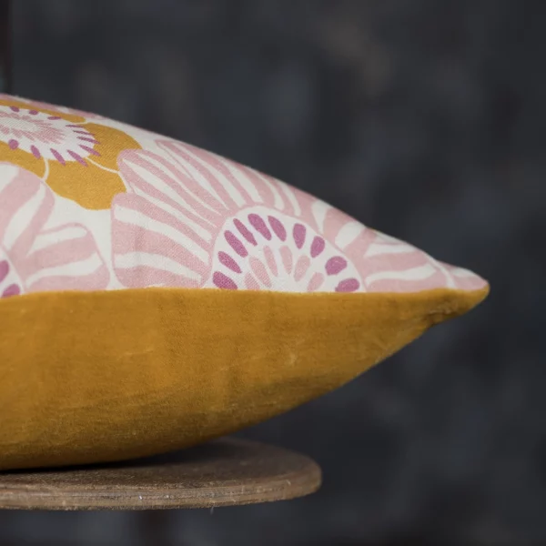 Double-sided cushion in cotton and cotton velvet. On one side it presents a print with a retro air in warm tones and the other side in a solid mustard colour. Includes silicone fiber inner cushion.